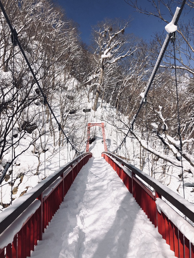 Today, I took a day trip to Jozankeionsennishi, a tranquil hot spring area just outside Sapporo. If you’re visiting during winter, this is the perfect place to warm up in one of the many onsen (hot springs) surrounded by snow-covered mountains. When I was exploring the area, I came across this picturesque red bridge covered in snow.